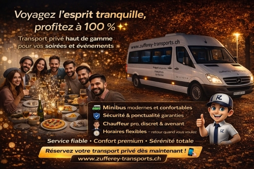Pour des moments inoubliables et des expériences de transport exceptionnelles, faites confiance à Zufferey-Transports. Appelez-nous au +41 78 221 08 04 ou envoyez-nous un e-mail ICI pour discuter de vos besoins et réserver vos prochains déplacements. Nous sommes impatients de vous servir et de vous offrir le meilleur en matière de transport !